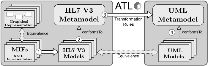 La transformació comença amb els arxius MIF de l’estàndard HL7 V3, els quals contenen la representació XML més detallada dels models d’informació gràfica en l’estàndard HL7 V3. Els arxius MIF es processen i esdevenen instàncies del metamodel HL7 V3. Llavors, el motor ATL executa un conjunt de regles de transformació especificades en el context del metamodel HL7 V3 per traduir els seus elements al metamodel d’UML. Com a resultat, la transformació produeix automàticament un model d’UML, que és una instància vàlida del metamodel d’UML, per a cada model HL7 V3.